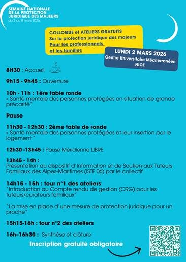 Colloque gratuit, le 2 mars 2026 au CUM à NICE, dédié à la protection juridique (tutelle, curatelle, habilitation familiale) à l’attention des professionnels et des familles.